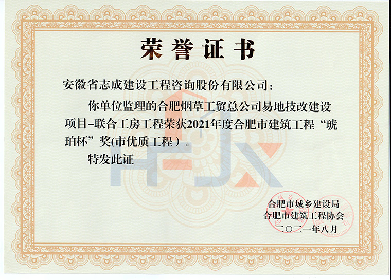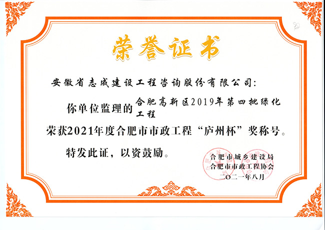 我公司合肥市特殊教育中心北校區工程、政務區祁門路幼兒園及地下車庫工程、合肥煙草工貿總公司易地技改建設項目-聯合工房工程喜獲2021年度合肥市建筑工程“琥珀杯”獎;.瑤海區小板橋河水體達標整治理工程、合肥高新區2019年度第四批綠化工程、分水嶺路(新港路-團肥路)工程、新站高新區淮海大道(新蚌埠路-文忠路)綠線綠化及淮海大道(前嶺路-畢昇路)污水管道修復工程、撮鎮星光大道等四條道路綠化提升工程、安徽居巢經濟開發區投資有限公司S105與S208連接線工程殷家山路、朝陽山路、平頂山工程、肥東縣縣級道路暢通工程(馬湖至石塘)道路綠化工程喜獲2021年度合肥市市政工程“廬州杯”獎。