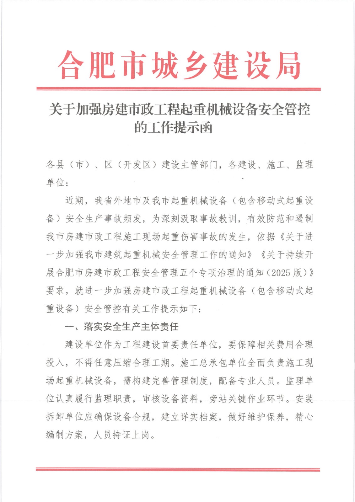 合肥市城鄉建設局《關于加強房建市政工程起重機械設備安全管控的工作提示函》